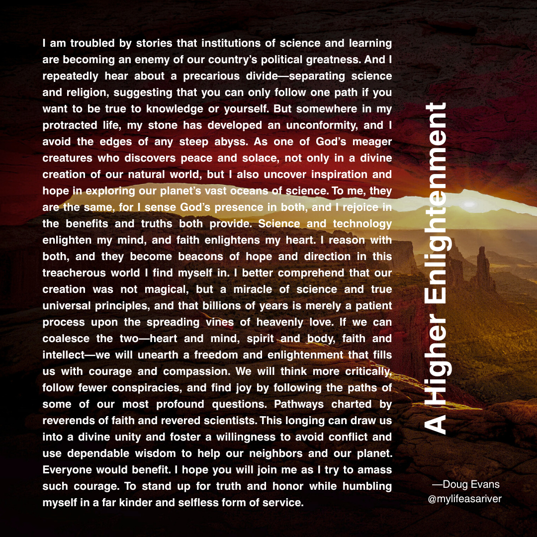 I am troubled by stories that institutions of science and learning are becoming an enemy of our country’s political greatness. And I repeatedly hear about a precarious divide—separating science and religion, suggesting that you can only follow one path if you want to be true to knowledge or yourself. But somewhere in my protracted life, my stone has developed an unconformity, and I avoid the edges of any steep abyss. As one of God’s meager creatures who discovers peace and solace, not only in a divine creation of our natural world, but I also uncover inspiration and hope in exploring our planet’s vast oceans of science. To me, they are the same, for I sense God’s presence in both, and I rejoice in the benefits and truths both provide. Science and technology enlighten my mind, and faith enlightens my heart. I reason with both, and they become beacons of hope and direction in this treacherous world I find myself in. I better comprehend that our creation was not magical, but a miracle of science and true universal principles, and that billions of years is merely a patient process upon the spreading vines of heavenly love. If we can coalesce the two—heart and mind, spirit and body, faith and intellect—we will unearth a freedom and enlightenment that fills us with courage and compassion. We will think more critically, follow fewer conspiracies, and find joy by following the paths of some of our most profound questions. Pathways charted by reverends of faith and revered scientists. This longing can draw us into a divine unity and foster a willingness to avoid conflict and use dependable wisdom to help our neighbors and our planet. Everyone would benefit. I hope you will join me as I try to amass such courage. To stand up for truth and honor while humbling myself in a far kinder and selfless form of service.